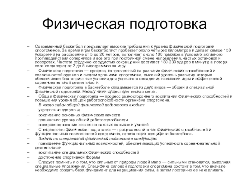 Физическая подготовка в баскетболе складывается из двух видов — общей и специальной физической подготовки. Между ними существует тесная связь.