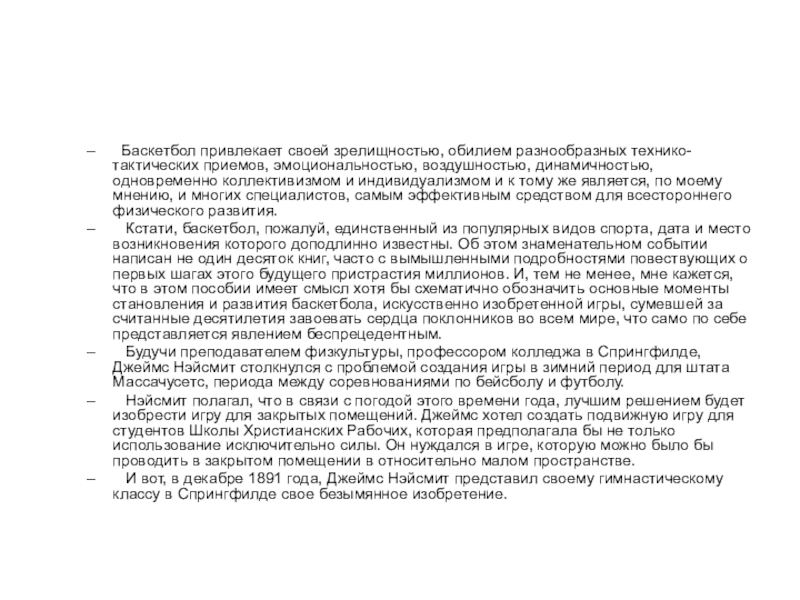 Кстати, баскетбол, пожалуй, единственный из популярных видов спорта, дата и место возникновения которого доподлинно известны. Об этом знаменательном событии написан не один десяток книг, часто с вымышленными подробностями повествующих о первых шагах этого будущего пристрастия миллионов. И, тем не менее, мне кажется, что в этом пособии имеет смысл хотя бы схематично обозначить основные моменты становления и развития баскетбола, искусственно изобретенной игры, сумевшей за считанные десятилетия завоевать сердца поклонников во всем мире, что само по себе представляется явлением беспрецедентным.