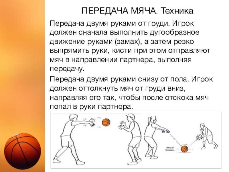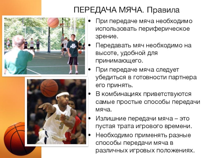 Передача — быстрейший способ продвижения мяча в баскетболе. Разумно, если передаче предшествует обманное движение, но при этом партнер не должен обмануться. В игре предпочтительнее короткие передачи, при них бывает меньше потерь мяча.