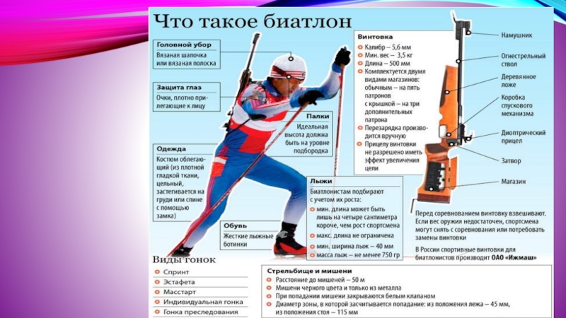 Слайд 2Биатло́н - зимний олимпийский вид спорта, сочетающий лыжную гонку со стрельбой