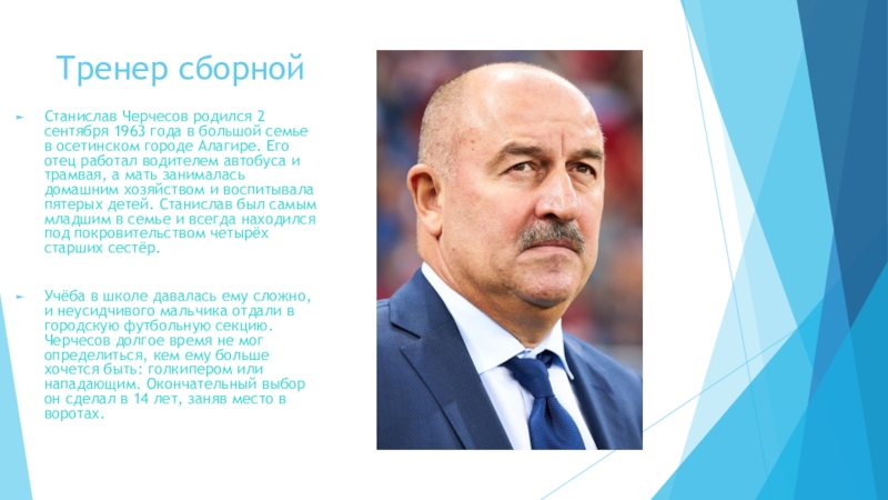 Тренер сборнойСтанислав Черчесов родился 2 сентября 1963 года в большой семье в осетинском городе Алагире. Его отец