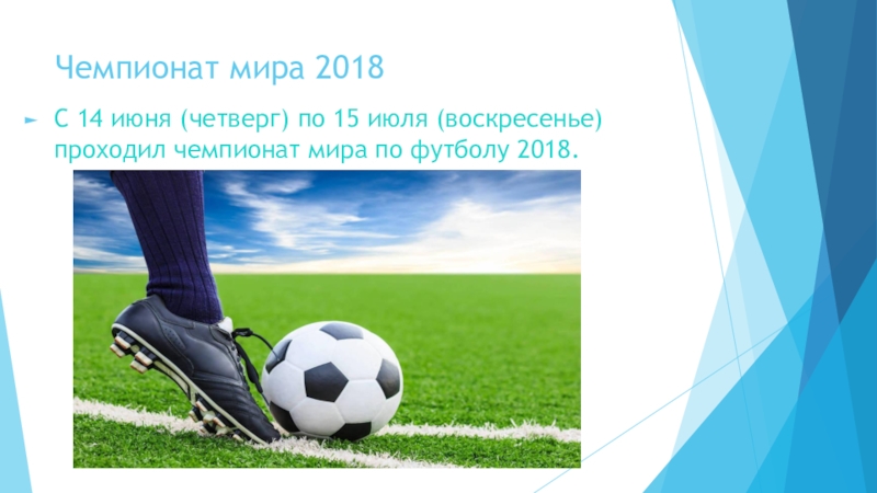 Чемпионат мира 2018С 14 июня (четверг) по 15 июля (воскресенье) проходил чемпионат мира по футболу 2018.