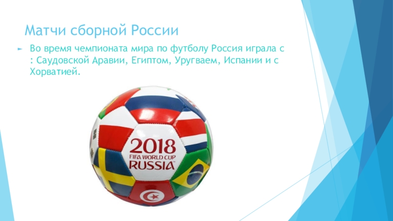 Матчи сборной РоссииВо время чемпионата мира по футболу Россия играла с : Саудовской Аравии, Египтом, Уругваем, Испании