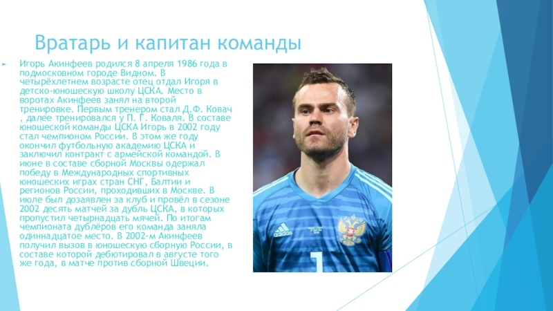 Вратарь и капитан командыИгорь Акинфеев родился 8 апреля 1986 года в подмосковном городе Видном. В четырёхлетнем возрасте