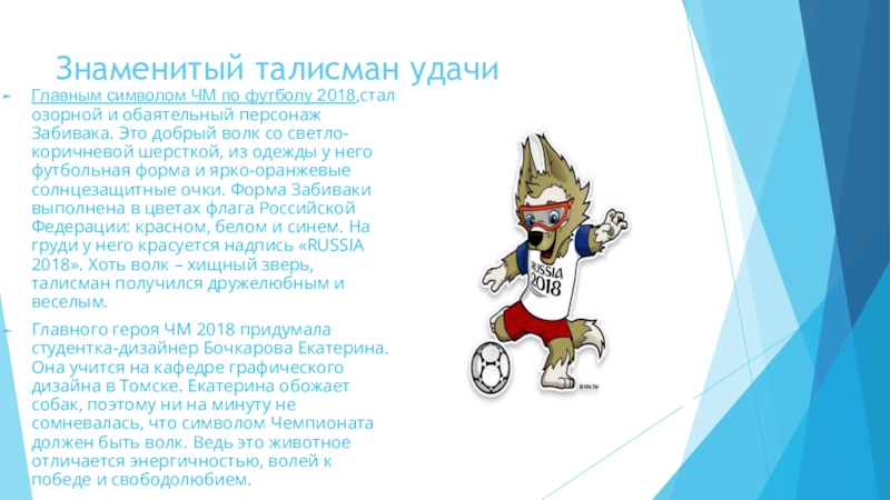 Главного героя ЧМ 2018 придумала студентка-дизайнер Бочкарова Екатерина. Она учится на кафедре графического дизайна в Томске. Екатерина обожает собак, поэтому ни на минуту не сомневалась, что символом Чемпионата должен быть волк. Ведь это животное отличается энергичностью, волей к победе и свободолюбием.