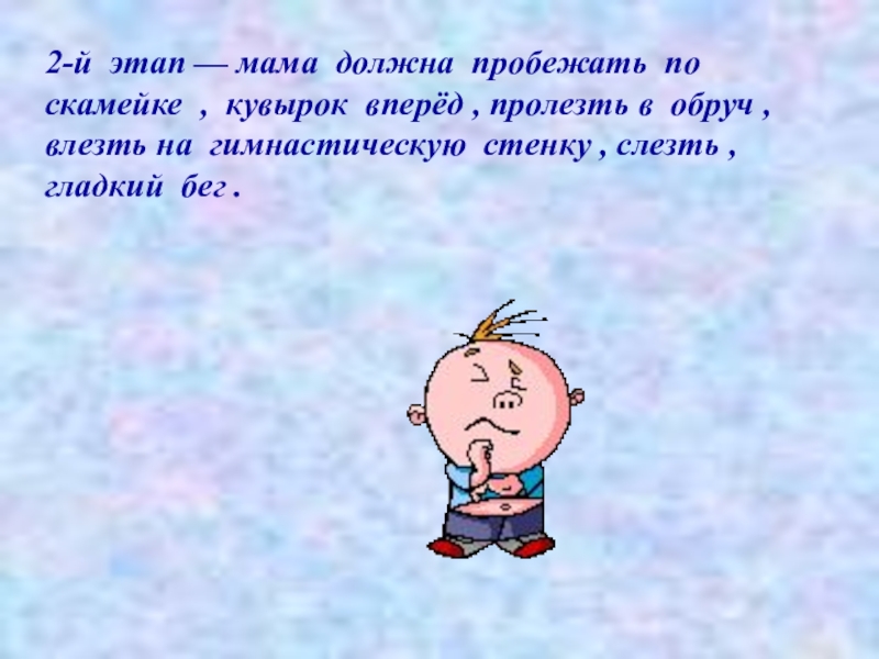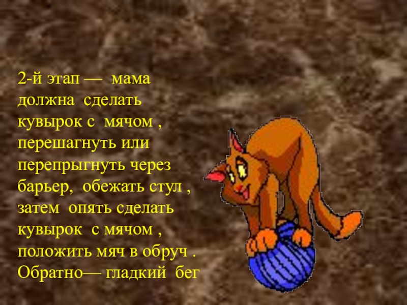 Слайд 112-й этап — мама должна сделать кувырок с мячом , перешагнуть