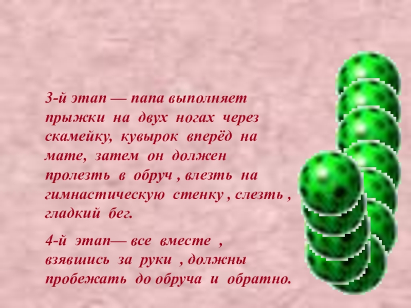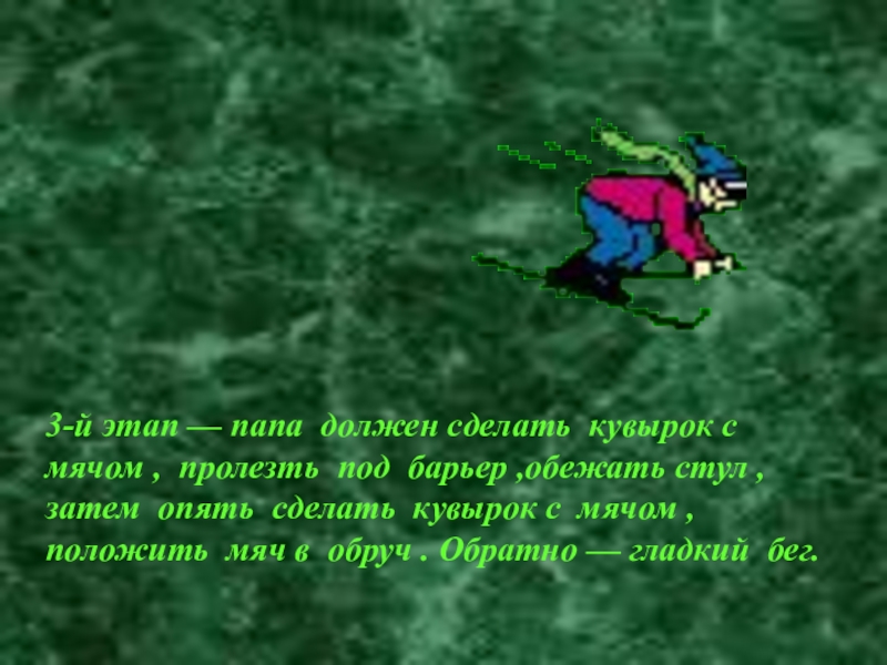 Слайд 123-й этап — папа должен сделать кувырок с мячом , пролезть