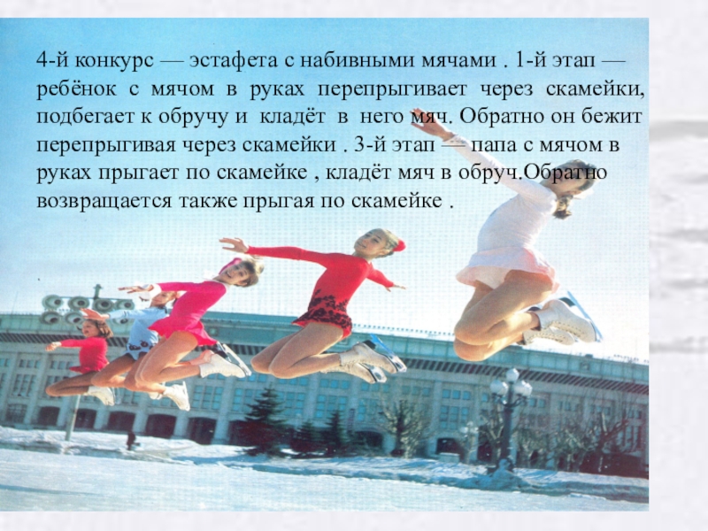 Слайд 86-й конкурс — эстафета с набивными мячами . 1- й —