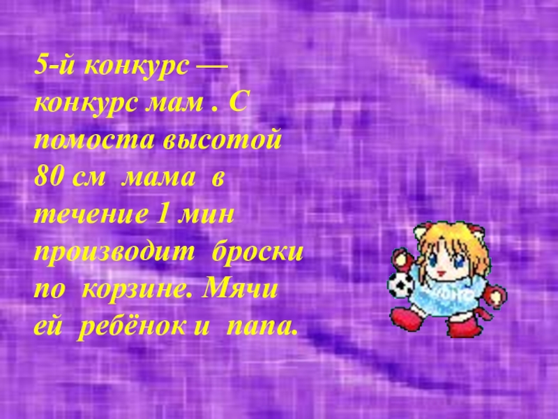 Слайд 75-й конкурс — конкурс мам . С помоста высотой 80 см