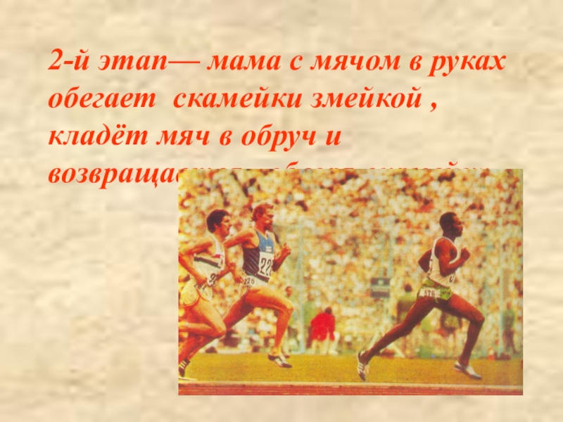 Слайд 62-й этап— мама с мячом в руках обегает скамейки змейкой ,