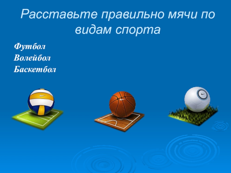 Расставьте правильно мячи по видам спортаФутбол     Волейбол     Баскетбол