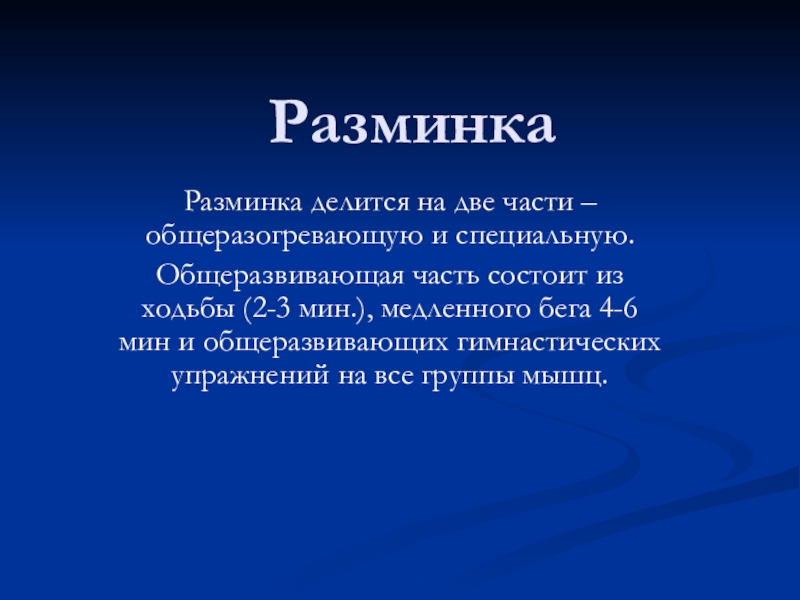 состоит из ходьбы (2-3 мин.), медленного бега 4-6 мин и общеразвивающих гимнастических упражнений на все группы мышц.