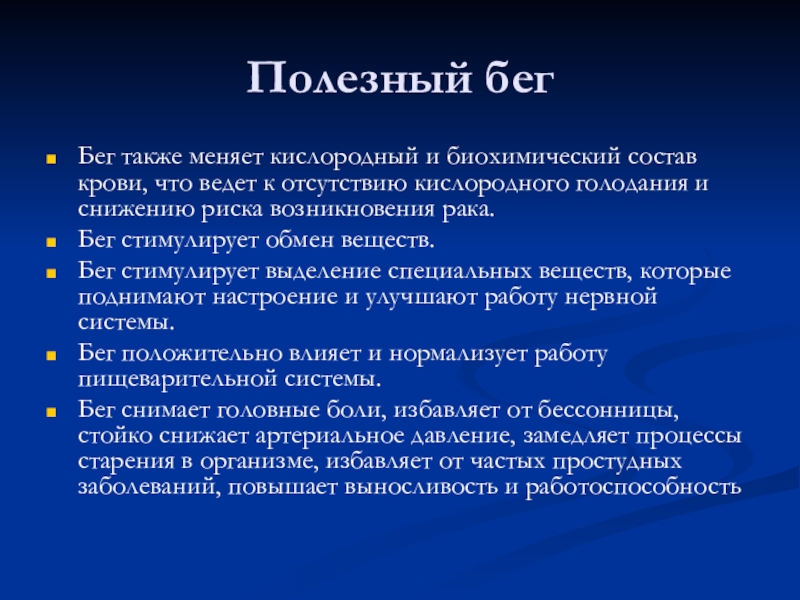 Бег снимает головные боли, избавляет от бессонницы, стойко снижает артериальное давление, замедляет процессы старения в организме, избавляет от частых простудных заболеваний, повышает выносливость и работоспособность