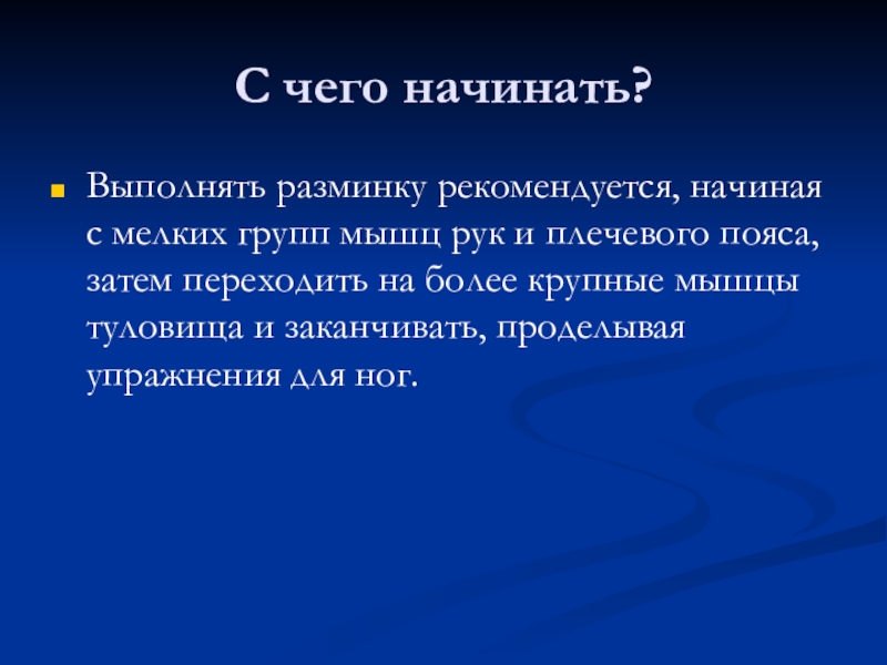 и плечевого пояса, затем переходить на более крупные мышцы туловища и заканчивать, проделывая упражнения для ног.
