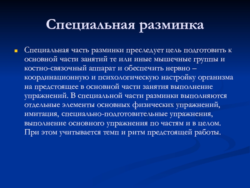 Специальная часть разминки преследует цель подготовить к основной части занятий