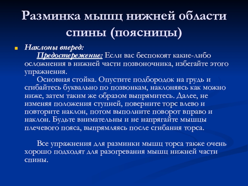 Слайд 11Разминка мышц нижней области спины (поясницы)