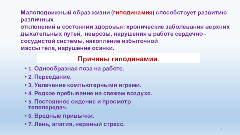 Малоподвижный образ жизни (гиподинамия) способствует развитию различных