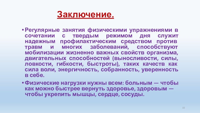 Регулярные занятия физическими упражнениями в сочетании с твердым режимом дня служит надежным профилактическим средством против травм и многих заболеваний, способствуют мобилизации жизненно важных свойств организма, двигательных способностей (выносливости, силы, ловкости, гибкости, быстроты), таких качеств как сила воли, энергичность, собранность, уверенность в себе.