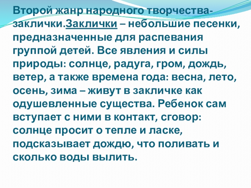 Слайд 12Второй жанр народного творчества-заклички.Заклички – небольшие песенки, предназначенные для распевания группой детей.