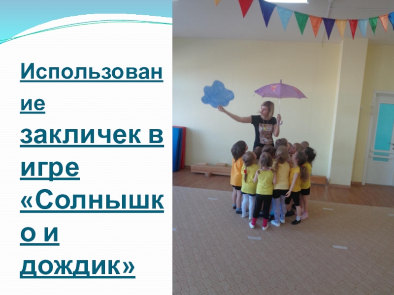 Слайд 13Использование закличек в игре «Солнышко и дождик»