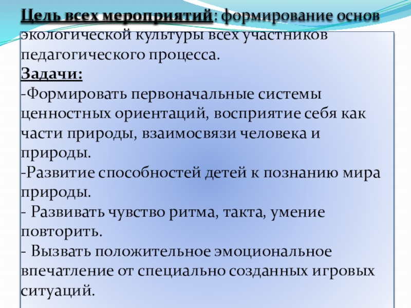 Слайд 5Цель всех мероприятий: формирование основ экологической культуры всех участников педагогического процесса.