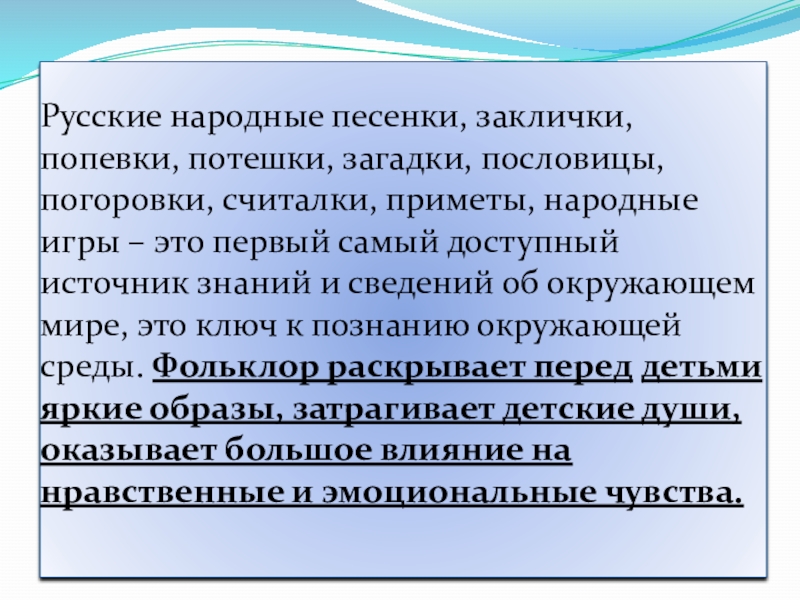 народные игры – это первый самый доступный источник знаний и сведений об окружающем мире, это ключ к познанию окружающей среды. Фольклор раскрывает перед детьми яркие образы, затрагивает детские души, оказывает большое влияние на нравственные и эмоциональные чувства.