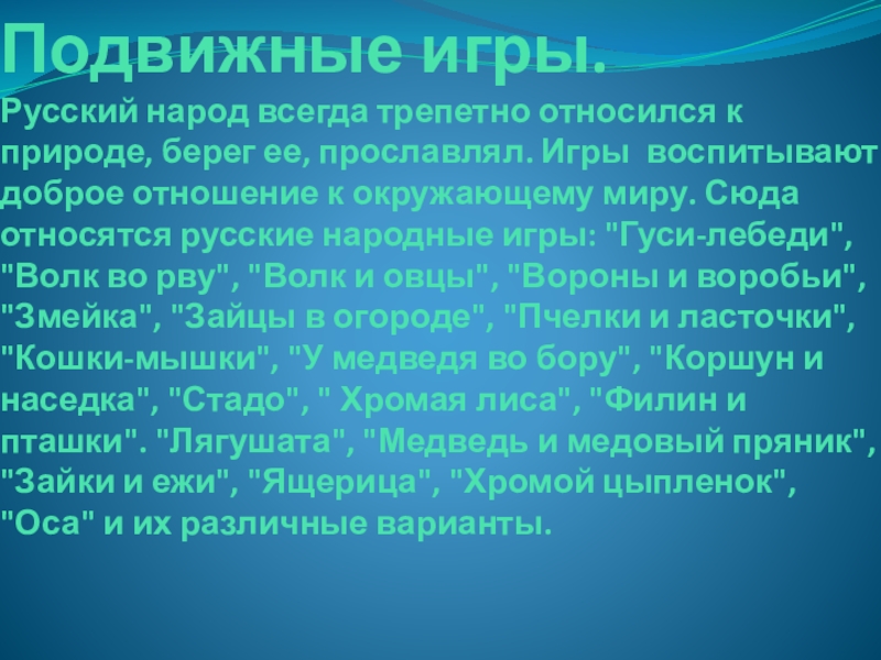 природе, активизирует их, учить действовать. Поэтому нужно как можно чаще прибегать к применению этих замечательных средств в повседневной практике педагогов дошкольных учреждений, использовать все педагогические ценности и возможности народных игр.