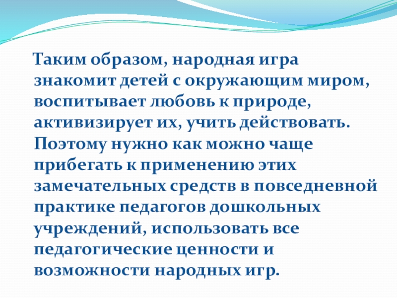 Слайд 15Таким образом, народная игра знакомит детей с окружающим миром,воспитывает любовь к