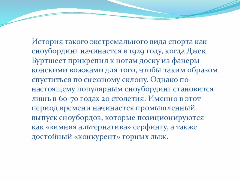 когда Джек Буртшеет прикрепил к ногам доску из фанеры конскими вожжами для того, чтобы таким образом спуститься по снежному склону. Однако по-настоящему популярным сноубординг становится лишь в 60-70 годах 20 столетия. Именно в этот период времени начинается промышленный выпуск сноубордов, которые позиционируются как «зимняя альтернатива» серфингу, а также достойный «конкурент» горных лыж.