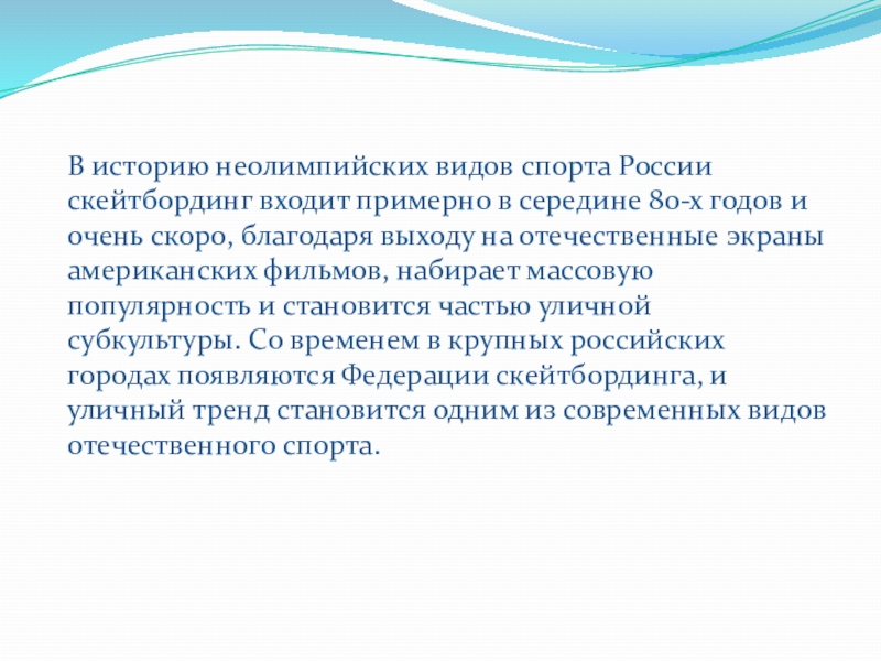 80-х годов и очень скоро, благодаря выходу на отечественные экраны американских фильмов, набирает массовую популярность и становится частью уличной субкультуры. Со временем в крупных российских городах появляются Федерации скейтбординга, и уличный тренд становится одним из современных видов отечественного спорта.