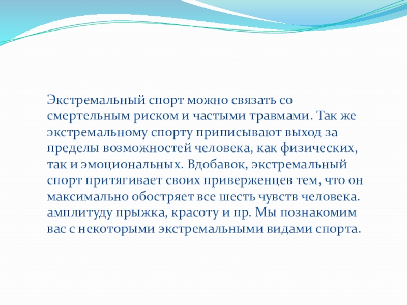 Слайд 13Экстремальный спорт можно связать со смертельным риском и частыми травмами. Так