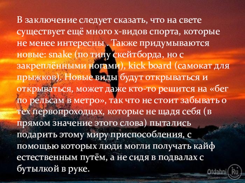 спорта, которые не менее интересны . Также придумываются новые: snake (по типу скейтборда, но с закреплёнными ногами), kick board (самокат для прыжков). Новые виды будут открываться и открываться, может даже кто-то решится на «бег по рельсам в метро», так что не стоит забывать о тех первопроходцах, которые не щадя себя (в прямом значение этого слова) пытались подарить этому миру приспособления, с помощью которых люди могли получать кайф естественным путём, а не сидя в подвалах с бутылкой в руке.