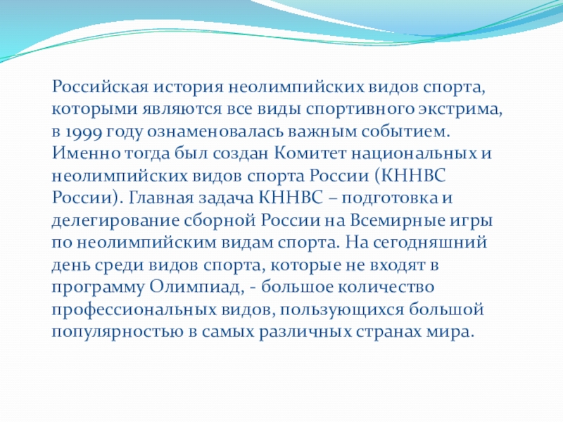 в 1999 году ознаменовалась важным событием. Именно тогда был создан Комитет национальных и неолимпийских видов спорта России (КННВС России). Главная задача КННВС – подготовка и делегирование сборной России на Всемирные игры по неолимпийским видам спорта. На сегодняшний день среди видов спорта, которые не входят в программу Олимпиад, - большое количество профессиональных видов, пользующихся большой популярностью в самых различных странах мира.