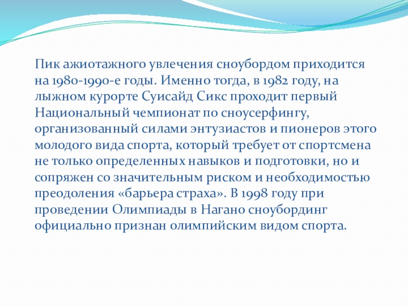 Слайд 7Пик ажиотажного увлечения сноубордом приходится на 1980-1990-е годы. Именно тогда, в