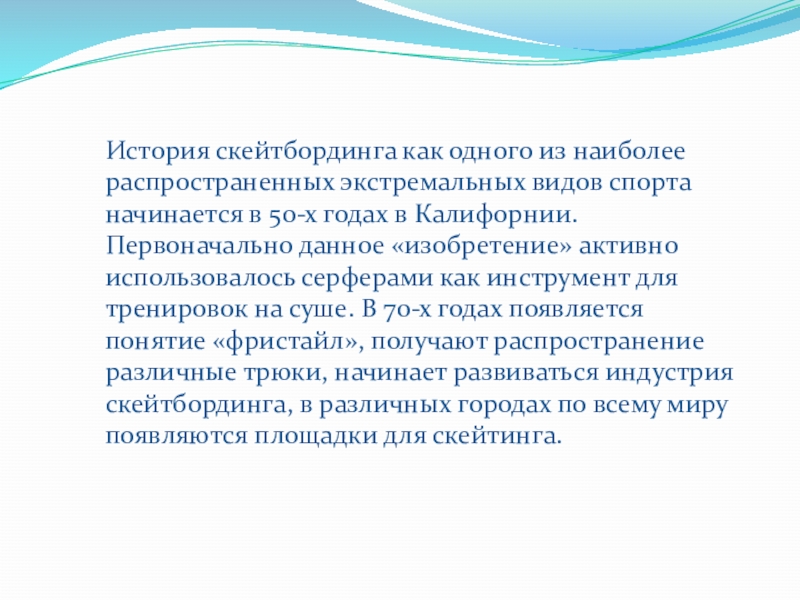 Слайд 8История скейтбординга как одного из наиболее распространенных экстремальных видов спорта начинается