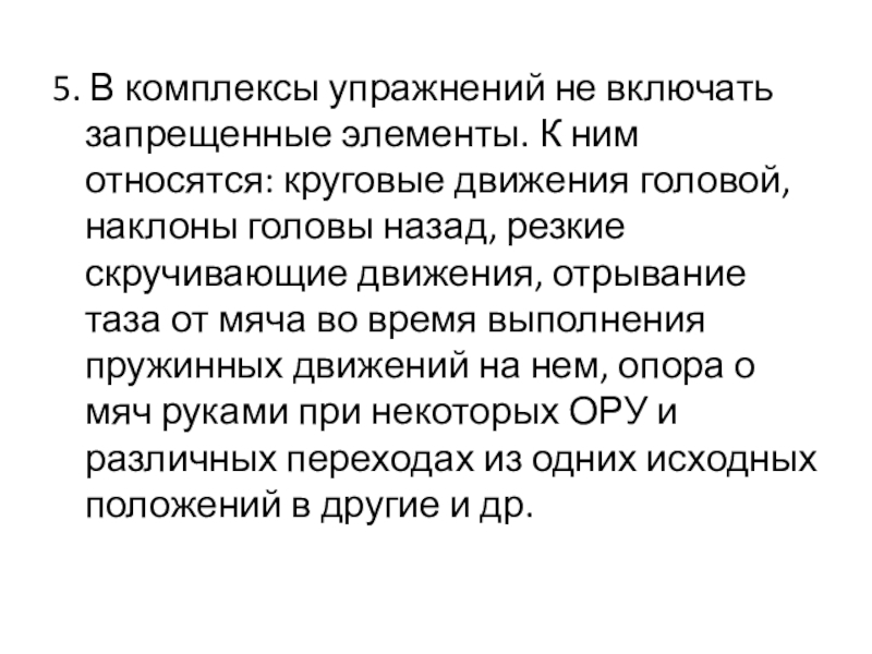 Слайд 115. В комплексы упражнений не включать запрещенные элементы. К ним относятся: