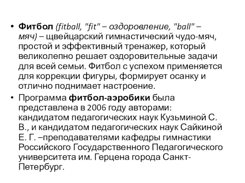 Программа фитбол-аэробики была представлена в 2006 году авторами: кандидатом педагогических наук Кузьминой С. В., и кандидатом педагогических наук Сайкиной Е. Г. –преподавателями кафедры гимнастики Российского Государственного Педагогического университета им. Герцена города Санкт-Петербург.