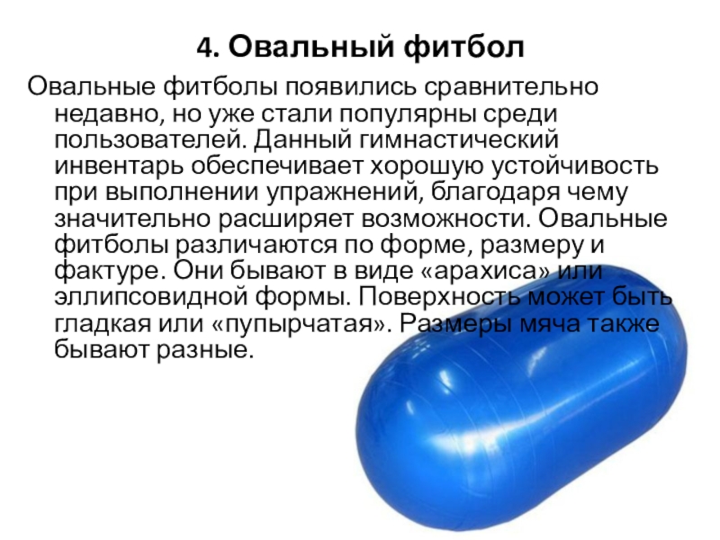 среди пользователей. Данный гимнастический инвентарь обеспечивает хорошую устойчивость при выполнении упражнений, благодаря чему значительно расширяет возможности. Овальные фитболы различаются по форме, размеру и фактуре. Они бывают в виде «арахиса» или эллипсовидной формы. Поверхность может быть гладкая или «пупырчатая». Размеры мяча также бывают разные.