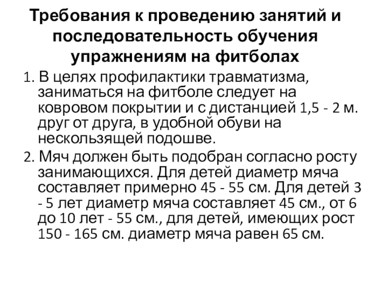 Слайд 9Требования к проведению занятий и последовательность обучения упражнениям на фитболах