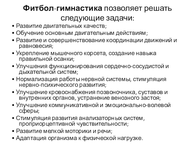 Слайд 3Фитбол-гимнастика позволяет решать следующие задачи: