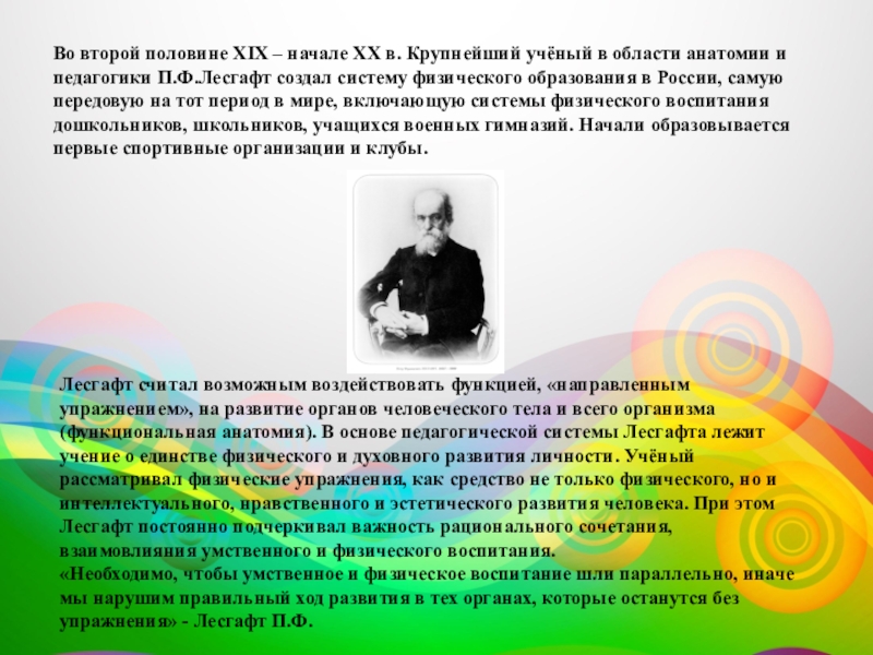 области анатомии и педагогики П.Ф.Лесгафт создал систему физического образования в России, самую передовую на тот период в мире, включающую системы физического воспитания дошкольников, школьников, учащихся военных гимназий. Начали образовывается первые спортивные организации и клубы.