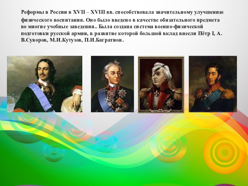 физического воспитания. Оно было введено в качестве обязательного предмета во многие учебные заведения.. Была создана система военно-физической подготовки русской армии, в развитие которой большой вклад внесли Пётр I, А.В.Суворов, М.И.Кутузов, П.И.Багратион.