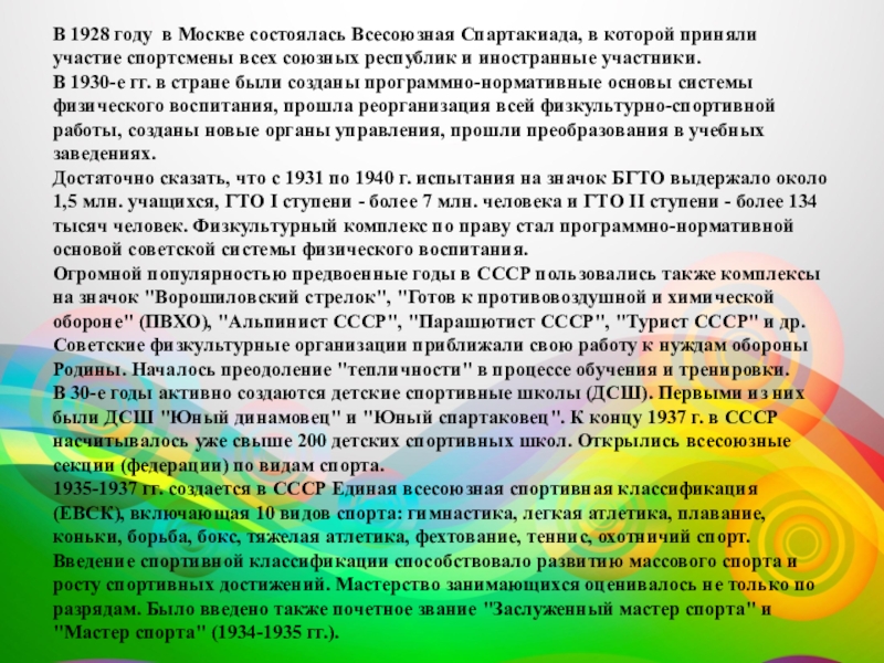 В 1930-е гг. в стране были созданы программно-нормативные основы системы физического воспитания, прошла реорганизация всей физкультурно-спортивной работы, созданы новые органы управления, прошли преобразования в учебных заведениях.