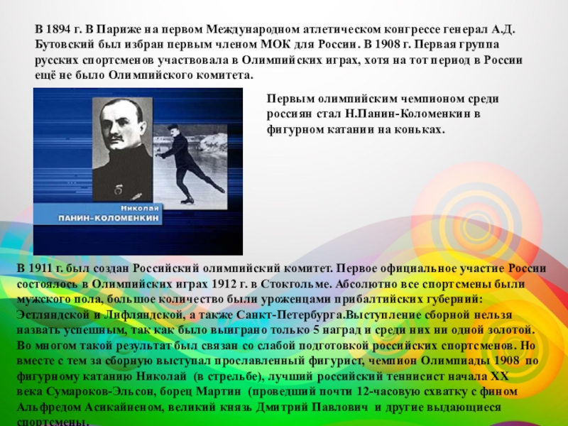 А.Д.Бутовский был избран первым членом МОК для России. В 1908 г. Первая группа русских спортсменов участвовала в Олимпийских играх, хотя на тот период в России ещё не было Олимпийского комитета.