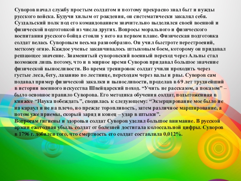 Слайд 5Суворов начал службу простым солдатом и поэтому прекрасно знал быт и