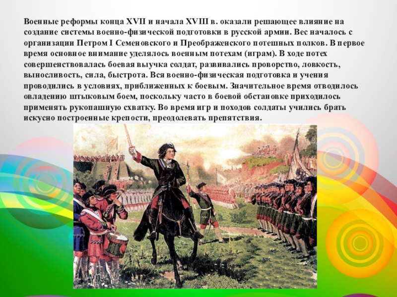 на создание системы военно-физической подготовки в русской армии. Вес началось с организации Петром I Семеновского и Преображенского потешных полков. В первое время основное внимание уделялось военным потехам (играм). В ходе потех совершенствовалась боевая выучка солдат, развивались проворство, ловкость, выносливость, сила, быстрота. Вся военно-физическая подготовка и учения проводились в условиях, приближенных к боевым. Значительное время отводилось овладению штыковым боем, поскольку часто в боевой обстановке приходилось применять рукопашную схватку. Во время игр и походов солдаты учились брать искусно построенные крепости, преодолевать препятствия.