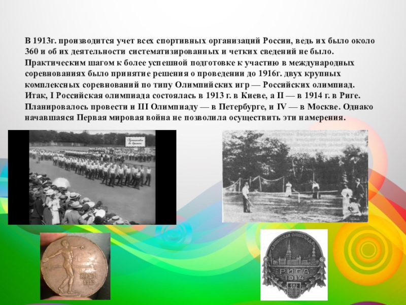 около 360 и об их деятельности систематизированных и четких сведений не было. Практическим шагом к более успешной подготовке к участию в международных соревнованиях было принятие решения о проведении до 1916г. двух крупных комплексных соревнований по типу Олимпийских игр — Российских олимпиад.