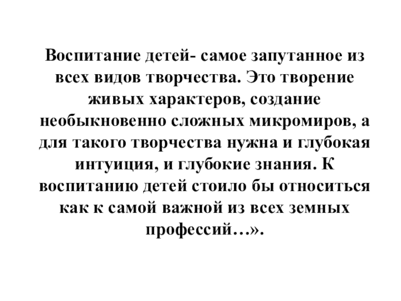 характеров, создание необыкновенно сложных микромиров, а для такого творчества нужна и глубокая интуиция, и глубокие знания. К воспитанию детей стоило бы относиться как к самой важной из всех земных профессий…».