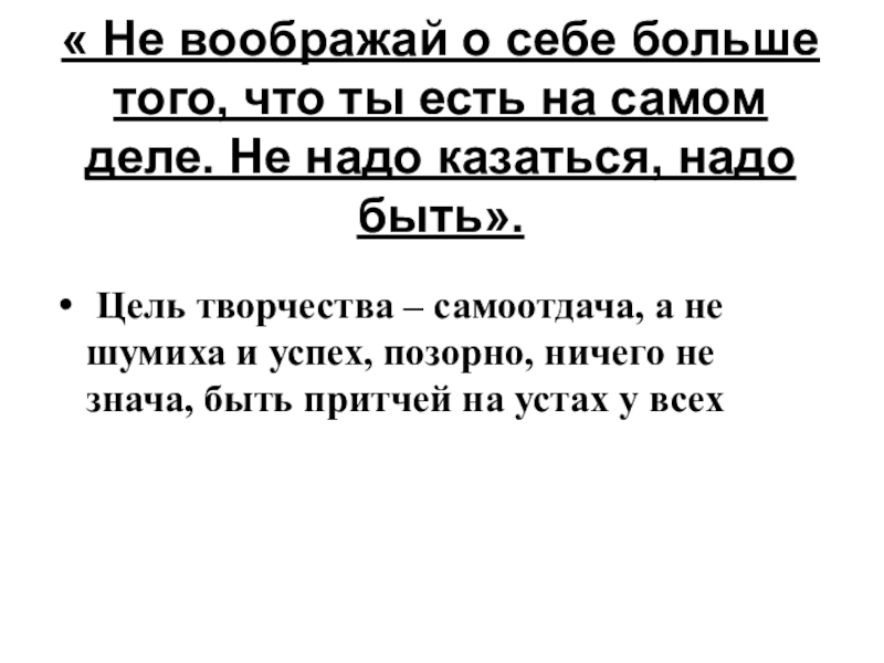Цель творчества – самоотдача, а не шумиха и успех, позорно, ничего не знача, быть притчей на устах у всех