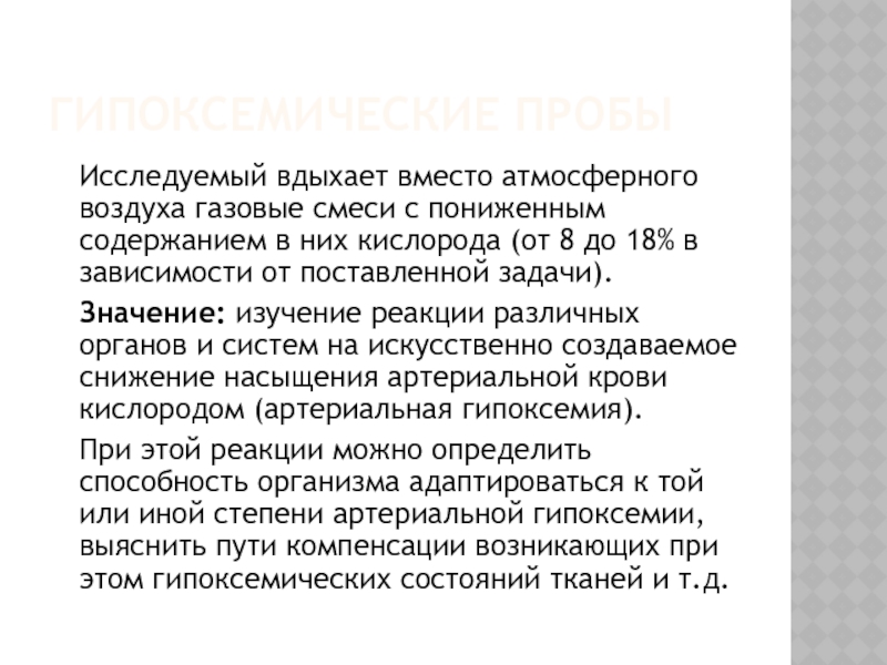 Значение: изучение реакции различных органов и систем на искусственно создаваемое снижение насыщения артериальной крови кислородом (артериальная гипоксемия).
